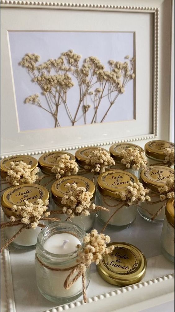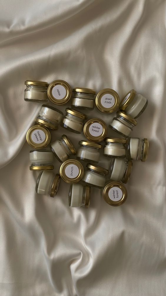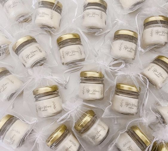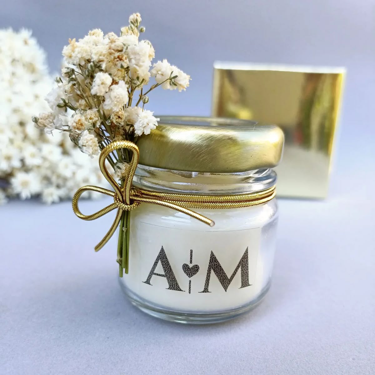 Vela aromática en frasco de vidrio con tapa dorada. Ideal para personalizar con etiquetas para eventos.