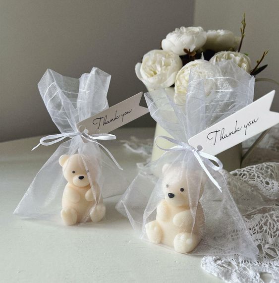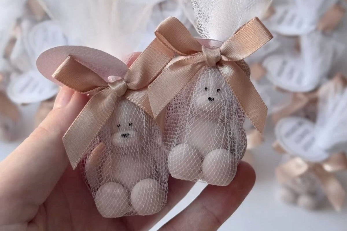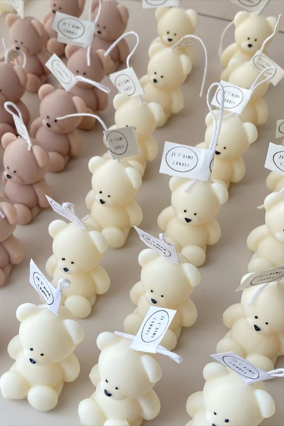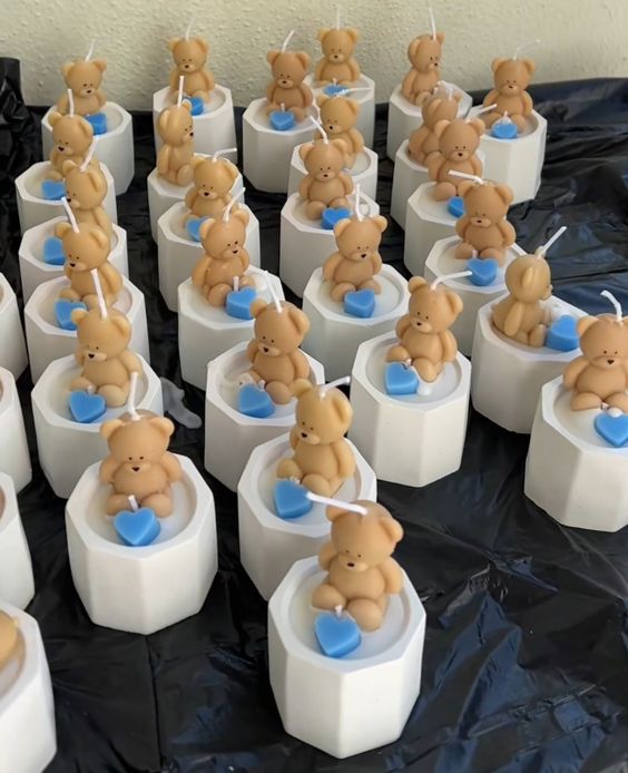 Vela artesanal de cera de soya en forma de oso. Perfecta para baby shower o celebraciones infantiles.