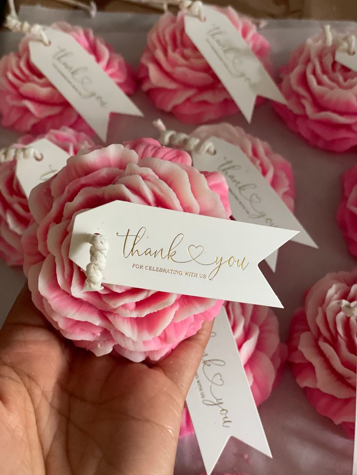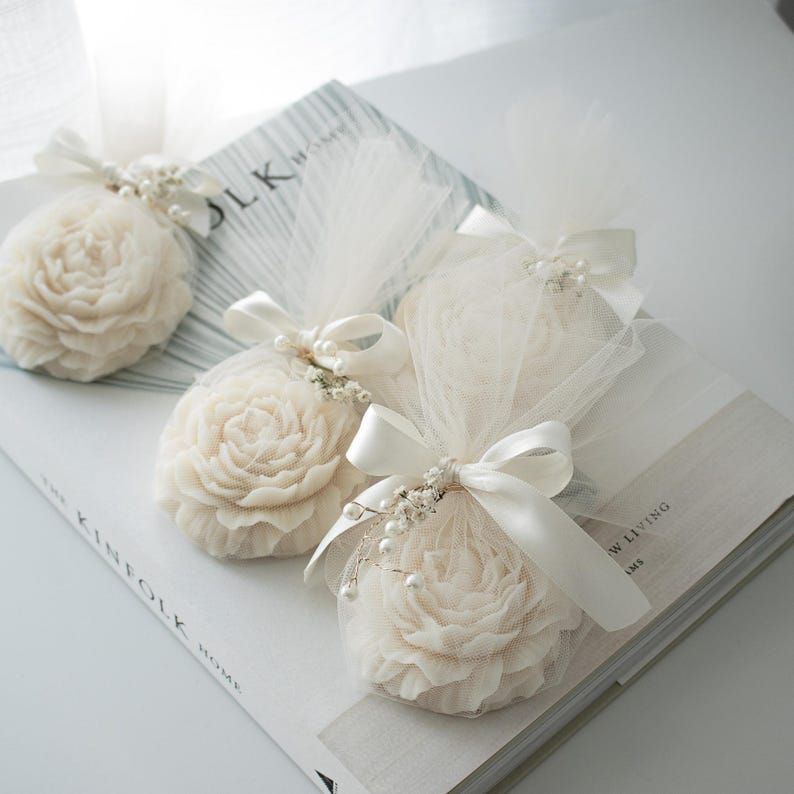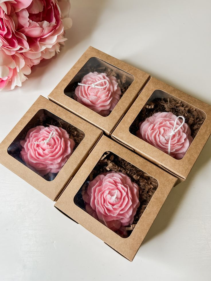 Vela en forma de peonía hecha a mano con cera de soya. Aroma delicado y diseño romántico.