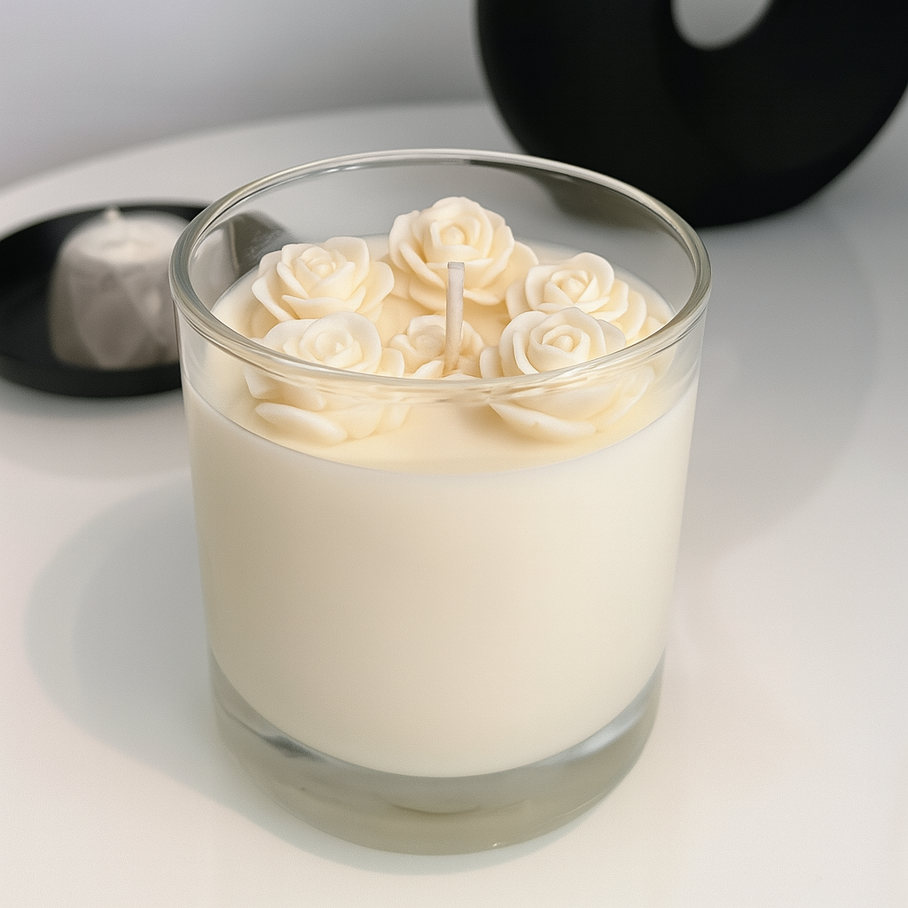 Vela artesanal de cera de soya y abeja. Diseño decorativo y fragancias naturales.